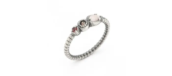 Anillo de plata. Engastado con piedras semipreciosas. Piedra ojo de gato rosa, granate y circonita brown. Largo pieza central 14mm y 5mm de ancho. Disponible en varias tallas. Diseño elaborado en España 100% artesanal.