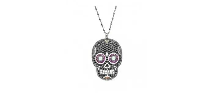 Colgante calavera grande de plata. Engastado con piedras semipreciosas. Piedras espinelas, ojos calcedonia, orla circonita fucsia. Medida calavera 36x47mm. Cadena doble de plata con baño de rutenio y rosario de ónix, largo 80 cm.