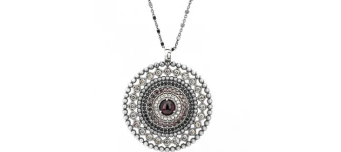 Colgante de plata. Engastado con piedras semipreciosas. Piedra central granate y circonita cava, brown. Medida diametro colgante 43mm. Cadena lapidada rutenio largo 80cm.