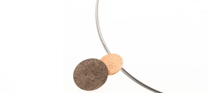 Colgante de plata envejecida de primera ley (925) y oro amarillo texturado mate de 18 Quilates. Sirga de acero de 42 ó 45 cm.