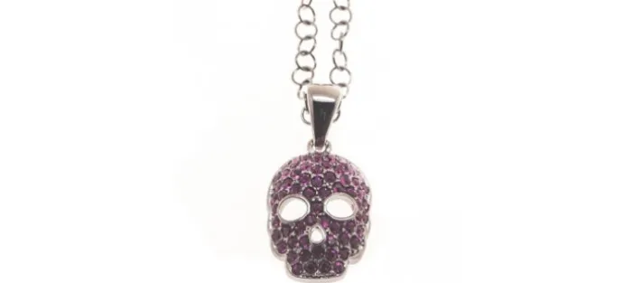 Colgante en forma de calavera en plata de primera ley (925) con baño de rodio y cristales Swaroski rosas.