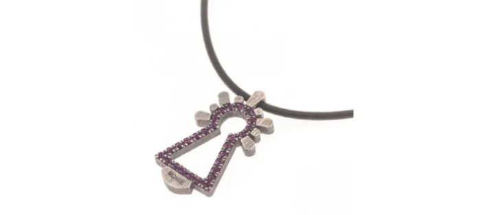 Colgante de plata envejecida de primera ley (925) con Circonitas fuxia y caucho de 42 cm. (Posibilidad de hacer el caucho en cualquier medida).Medida del colgante: 3.5cm de largo.