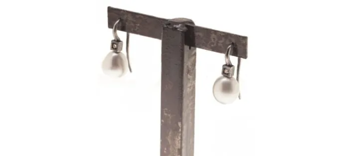 Pendientes de plata envejecida de primera ley (925), perla cultivada y brillante color coñac. Peso aproximado de los brillantes: 0,14 Cts.