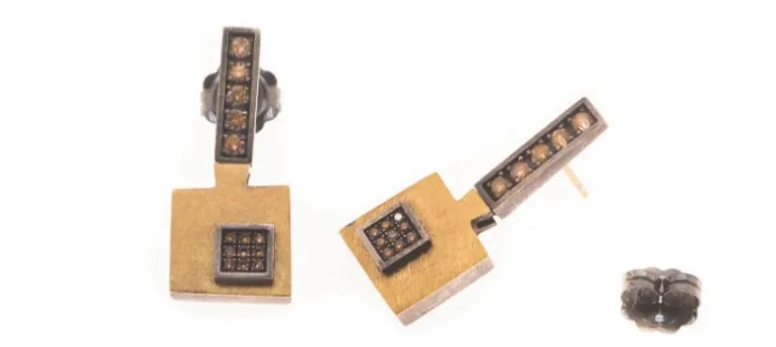 Pendiente cuadrado de plata envejecida de primera ley (925) y oro amarillo de 18 K. Perno tambien en oro amarillo de 18 K. Cada pendiente lleva engastado 9 diamantes marrones de 1,4 mm y 0,14 Quilates (Peso aproximado de todos los diamantes: 0,28 Quilates). La parte de arriba es una pieza rectangular de 20mm X 9mm con 5 diamantes coñac de 2,7mm y 0,40 Quilates.