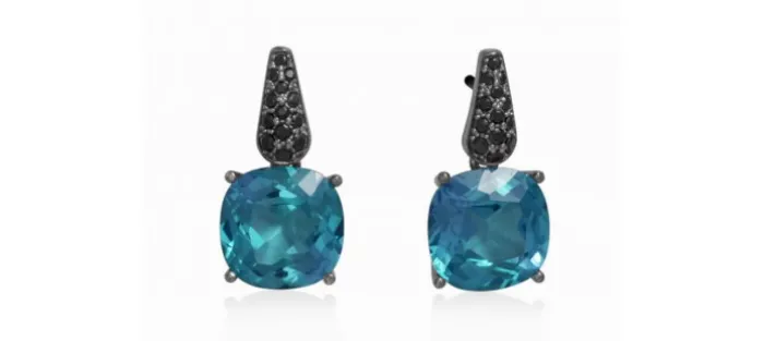 Plata de primera ley (925) con baño de color, zirconitas negras y cuarzo azul.