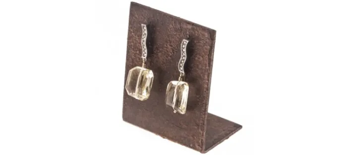 Pendiente sinuoso de plata envejecida de primera ley (925) y oro amarillo de 18 Quilates. Cada pendiente lleva 8 diamantes coñac de 1,4mm (Peso total de los diamantes 0,28 Quilates) y un cuarzo Limón natural.