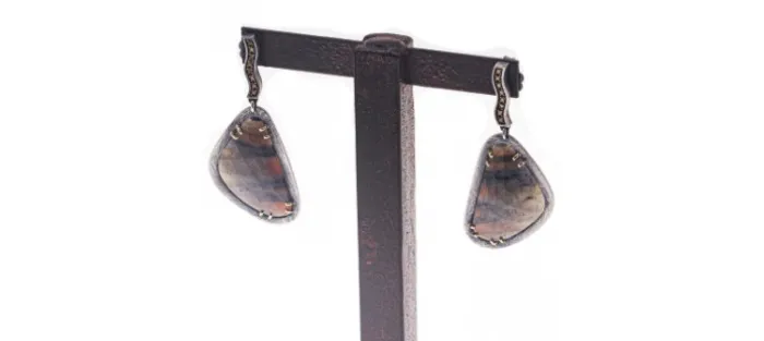 Pendientes sinuosos de plata envejecida de primera ley (925) y oro amarillo de 18 Quilates. Cada pendiente lleva 8 diamantes coñac de 1,4mm (Peso total de los diamantes 0,28 Quilates) y un multizafiro burdeos y verde natural.