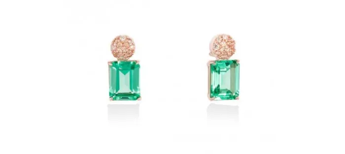 Pendientes de plata de primera ley (925) chapada en oro rosa de 18kt, circonita coñac y piedra sintetica color esmeralda. Tamaño 1,5 cm.