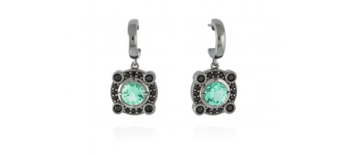 Pendientes de plata de primera ley (925) con baño de rutenio, espinela negra sintética y piedra sintetica color esmeralda. (tamaño: 2,5 cm.)