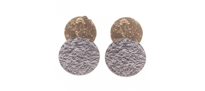 Pendiente de plata envejecida de primera ley (925) y oro amarillo texturado mate de 18 Quilates. Perno también en oro amarillo de 18 Quilates.