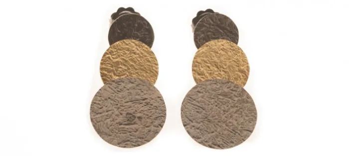 Pendiente de plata envejecida de primera ley (925) y oro amarillo texturado mate de 18 Quilates. Perno también en oro amarillo de 18 Quilates.