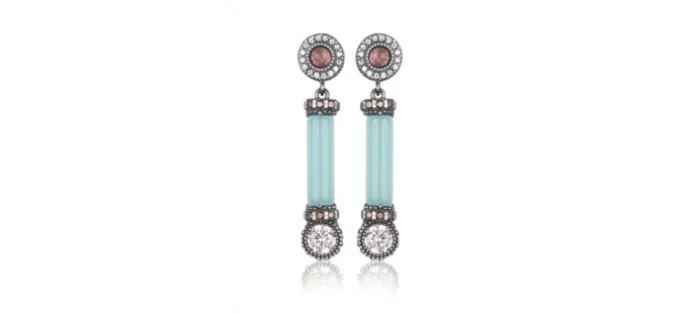 Pendientes fabricados en plata de ley 925 con acabado envejecido llevando una turmalina natural y un cilindro de calcedonia con circonitas color champán y rosa.