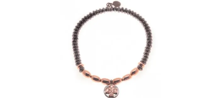 Pulsera de plata de primera ley (925) con baño de rutenio y chapado en oro rosa de 18 Kt., hematite facetado y circonitas coñac. Medida de muñeca 16,5 cm.