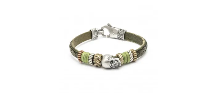 Pulsera cuero y plata con calavera central.