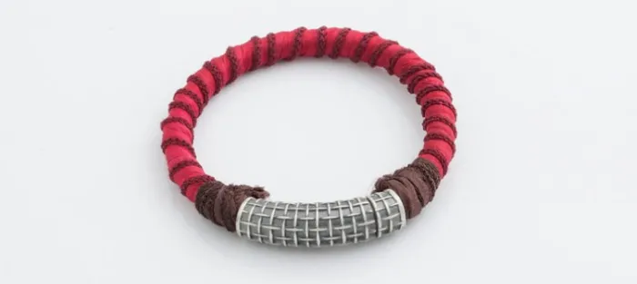 Pulsera plata envejecida de primera ley (925) y cuero forrado de seda.
