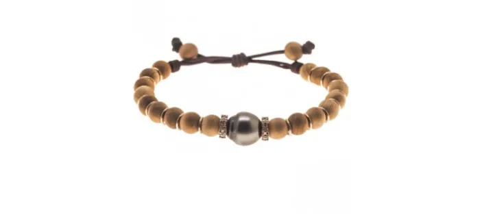 Pulsera unisex compuesta por: Madera de sándalo, oro rosa de 18k, 18 diamantes color coñac de 1,7mm, perla Tahití de 12,5 mm y nylon náutico.