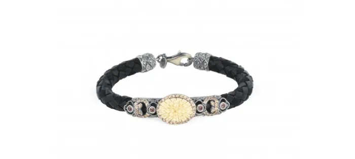 Pulsera de cuero negro (con mosquetón) y plata envejecida de primera ley (925) con hueso y Zirconitas marrones.