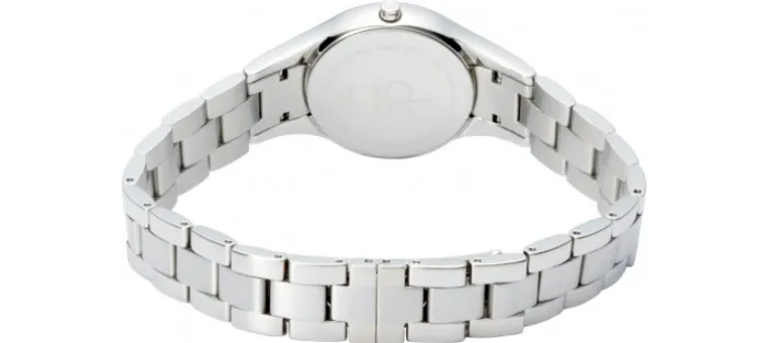 Caja y armis de acero 316L hipoalergénico (caja de 28 mm de diámetro). Esfera blanca con dos agujas y 9 diamantes auténticos . Corona con el logotipo de la marca cK. Resistente al agua 30 metrros. Cristal de zafiro.