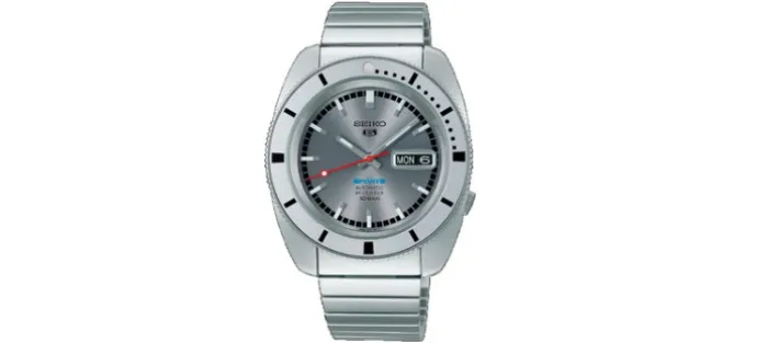 La esfera en plateado con el logotipo original de Seiko5 a las doce en punto. Agujas e índices con lumibrite.