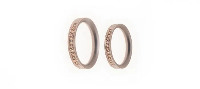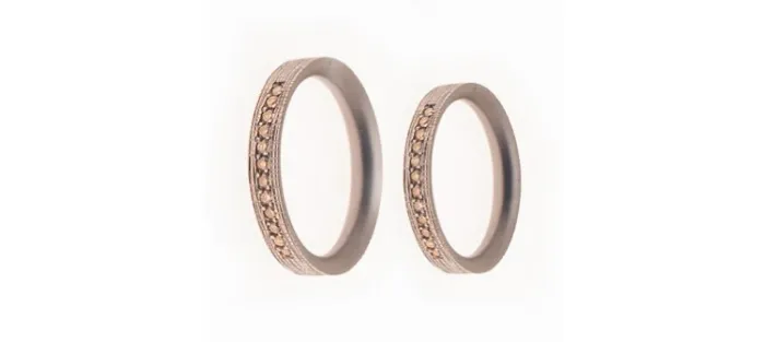 Alianzas de Oro blanco con fondo en rodio negro. Cada alianza lleva engastados 12 diamantes color coñac talla brillante de 1,4mm con un peso aproximado de 0,16 Quilates. Cada alianza pesa aproximadamente 5 gr.