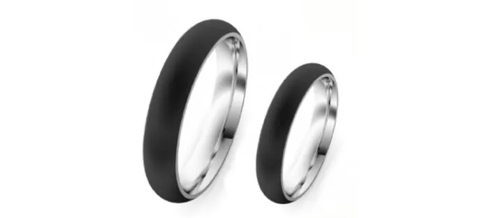 Anillo de oro blanco de 18 Q y carbono. Anchura: 4 mm, superficie mate ligeramente curvado tanto en el interior como en el exterior.
