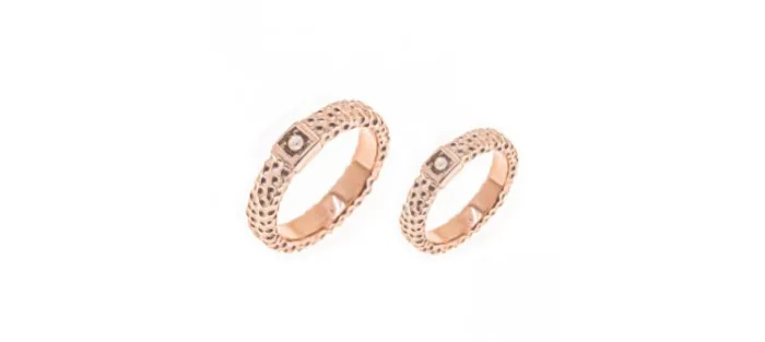 Alianzas de Oro Rrosa de 18k. Cada alianza pesa aproximadamente 4,7 gr y lleva un diamante coñac de 0,07 cts.