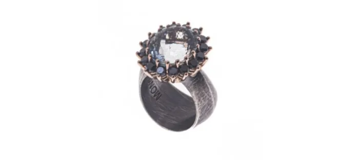 Espectacular anillo de oro rosa de primera ley (750), plata envejecida (925), agua marina natural (12,9 Cts) y 16 diamantes color negros de 3mm con un peso aproximado de 2,18 Cts.