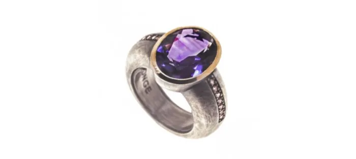Anillo de plata envejecida de primera ley (925), oro amarillo de 18k, amatista natural y diamantes color coñac.