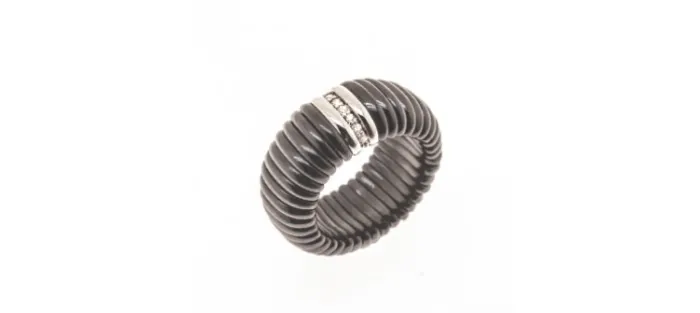 Anillo elástico de cerámica negra brillo con diamantes blancos y oro blanco de 18 K.