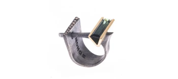 Sortija de plata envejecida de primera ley (925), oro amarillo de 18k, turmalina verde natural y diamantes color coñac. Peso aproximado de los diamantes: 0,28cts.