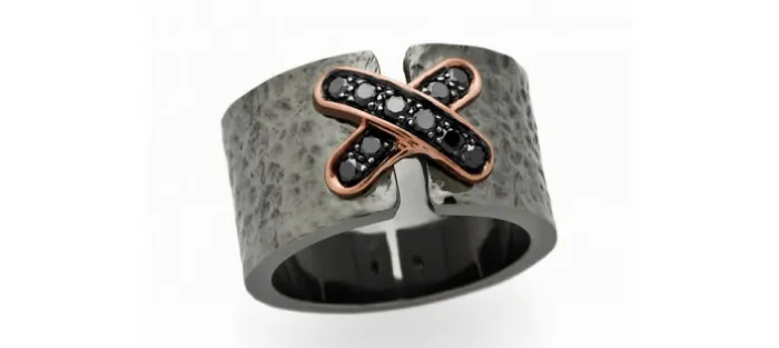 Anillo de plata envejecida con aspa en oro rosa y diamantes.