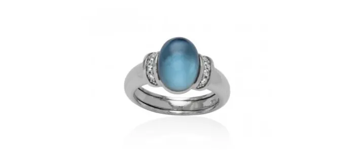 Sortija de plata de primera ley (925) con baño de rodio con circonita blanca y doblete de zafiro azul sintetico y nácar blanco.