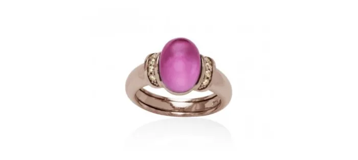 Sortija de plata de primera ley (925) chapada en oro rosa de 18kt con circonita coñac y doblete de zafiro sintetico rosa y nácar blanco.