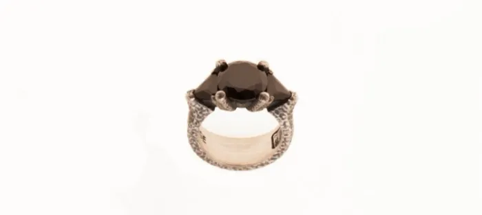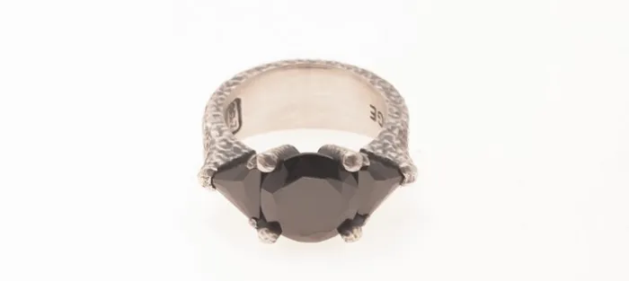 Zirconita central negra de 10mm de diámetro y 2 Zirconitas negras triangulares de 6x6x6 mm en brazo del anillo.