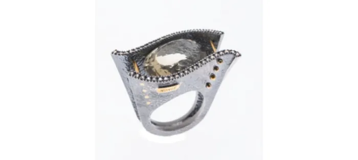 Sortija de plata envejecida de primera ley (925), oro amarillo de 18k, cuarzo citrino y diamantes color coñac. Peso aproximado de los diamantes: 0,58cts.