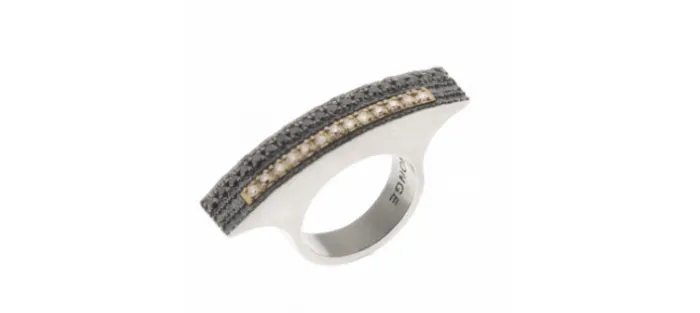 Anillo de plata envejecida de primera ley (925) y oro amarillo. En la parte superior lleva engastados 19 diamantes negros y 13 diamantes color coñac de 1,9mm con un peso aproxiamdo de 1,12 Cts.