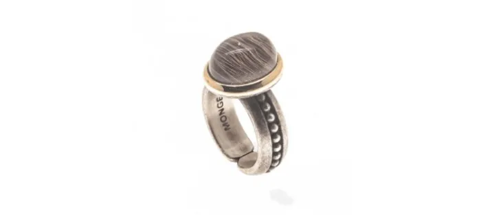 Anillo de plata envejecida de primera ley (925), oro amarillo de 18 Quilates y cuarzo Rutilado cabujón.