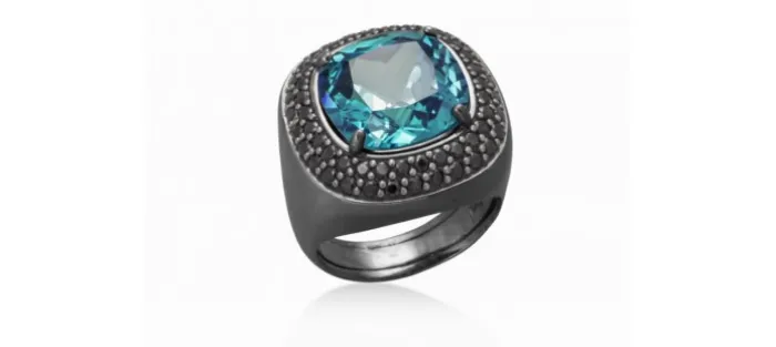 Plata de primera ley (925) con baño de color, zirconitas negras y cuarzo azul.