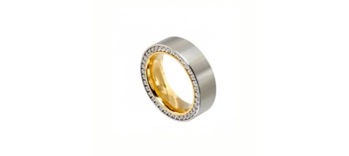 Anillo de acero e interior con tratamiento de PVD dorado y Zirconitas de Swarovski.