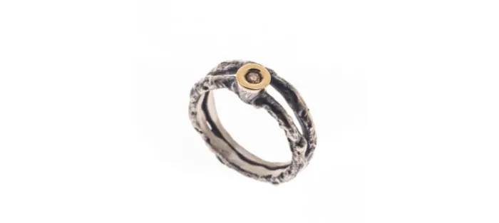 Anillo doble de plata envejecida de primera ley (925), boquilla de oro amarillo y diamante color coñac. Peso aproximado de la piedra: 0,06ct
