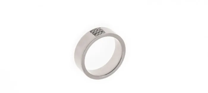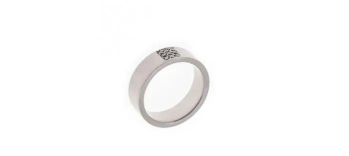 Anillo de acero Meise Neun. Lleva engastados nueve diamantes negros con un peso aproximado de 0.16 Quilates. Anchura del anillo: 7,5 mm.
