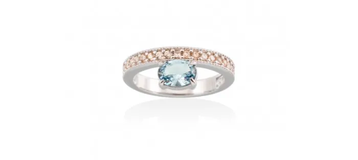 Anillo de plata de primera ley (925) con baño de rodio, circonita coñac y piedra sintetica color paraiba