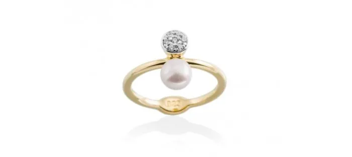 Anillo de plata de primera ley (925) chapada en oro de 18 Kt., circonitas blancas y perla cultivada.