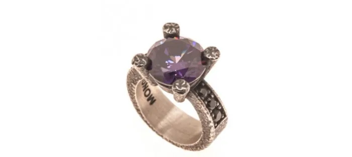 Zirconita central morada de 12mm de diámetro y 6 Zirconitas negras en brazo del anillo.