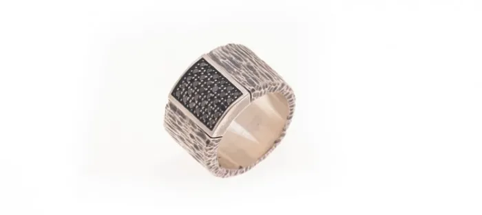 Anillo de plata envejecida de primera ley (925). LLeva engastados treinta diamantes negros de 1,4mm con un peso aproximado de 0,47 Quilates.