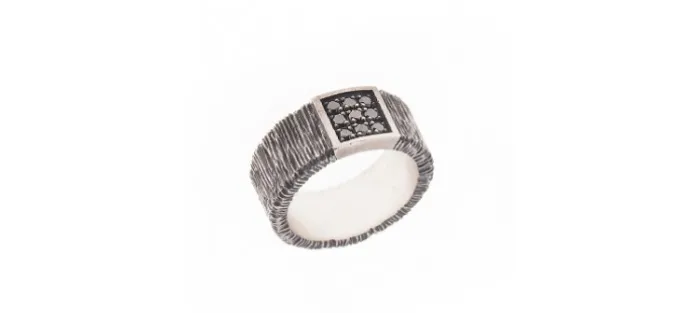 Anillo de plata envejecida de primera ley (925). LLeva engastados nueve diamantes negros de 1,9mm con un peso aproximado de 0,30 Quilates.