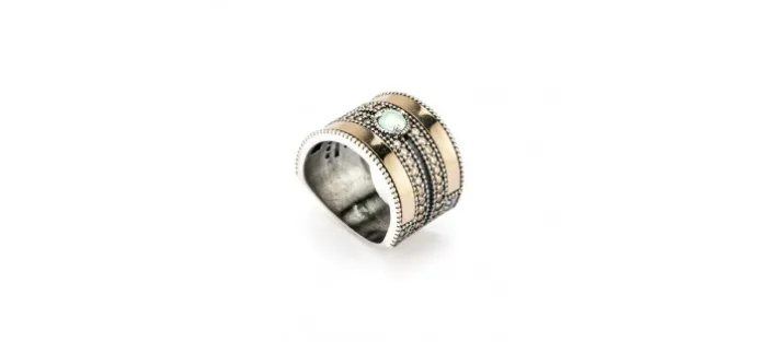 Anillo de 15mm de ancho con una piedra semipreciosa de 4mm, dos bandas de Oro de 9kt de 3mm en los laterales y dos bandas de circonitas.