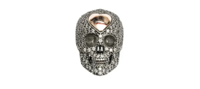 Anillo en forma de calavera repleto de circonitas blancas y con un corazón de oro de 9kt.