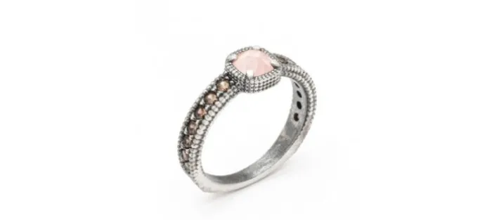 Anillo de plata. Engastado con piedras semipreciosas. Piedra central ojo de gato rosa de 5mm y circonitas brown.
