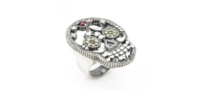 Anillo calavera plata grande. Engastado con piedras semipreciosas. Piedra central frente granate. Centro ojos circonitas cava y brown. Medida calavera 25x34mm.